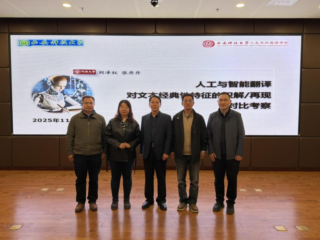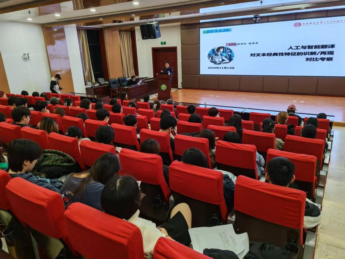 2025年11月13日晚7时,河南大学二级教授、博士生导师、河南省特聘教授刘泽权应邀来到西安科技大学“胡杨林大讲堂”,在骊山校园煤炭科技楼二楼报告厅作了题为“人工与智能翻译对文本经典性特征的识解/再现实证考察”的学术讲座。本次讲座由学院张辉副院长主持。时健教授等教师代表及200余名学生到场聆听。
