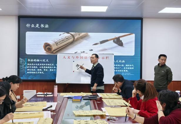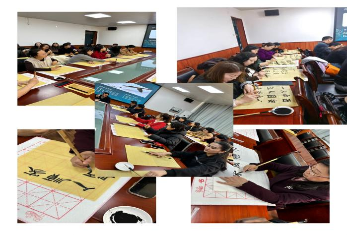 随后,受邀参加主题活动的中国翰林书画院院士、原校后勤基建党委书记薛奋勇老师为教职工们开展了书法知识科普与书写技法指导。薛老师系统介绍了楷书、行书、隶书等书体的特点与风格,现场示范毛笔握法、蘸墨技巧及基本笔画书写要领,针对书写常见问题逐一讲解。女教职工们认真聆听、积极提问,沉浸在浓厚的学习氛围中。技法指导结束后,女教职工们纷纷提笔创作,现场墨香四溢,大家相互观摩作品、分享创作心得,书法老师穿梭其间点评指导,给予专业建议与鼓励。活动全程欢声笑语不断,洋溢着温馨和谐的氛围。